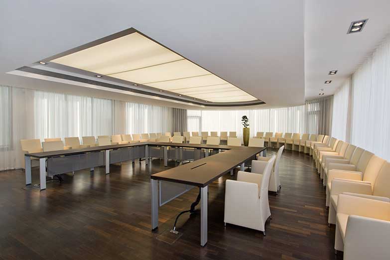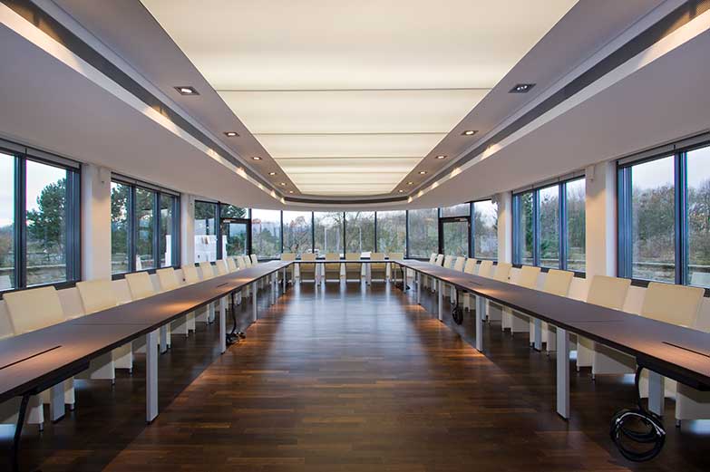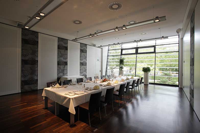 Im Obergeschoss des Neubaus finden sich 5 weitere, in Größe und Design identische Veranstaltungsräume. Die modernen und klimatisierten Räume sind kombinierbar und verfügen über bodentiefe Fensterfronten. Jeder Raum bietet Platz für 40 Personen, kostenloses W-Lan und eine steuerbare Lichttechnik mit elektrischer Verdunkelung.