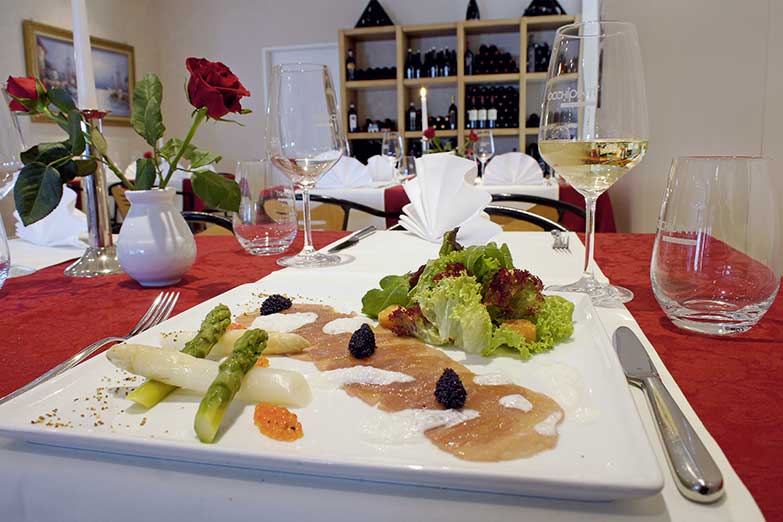 Natürlich steht die Heimat Italien im Focus der Küche, z.B. Rucolasalat mit gebratenen Austernpilzen, Shizokresse und Balsamico, Carpaccio vom Rinderfilet, Lachstartar mit Crostini, hausgemachte Tagliatelle mit frischen Trüffeln, Doradenfilet in Folie gegart mit Kräuterseitlingen und Kartoffeln oder Lammhaxe mit Bohnenbündchen und Gratinkartoffeln. Die Karte wird immer wieder erneuert. Besondere Tagesempfehlungen und Aktionen wie Fisch-Menues, Osterbrunch, Mai-Ball, Spargel- oder Schnitzelbuffets sorgen immer wieder für neue Anreize. Die Termine findet man auf der Webseite.