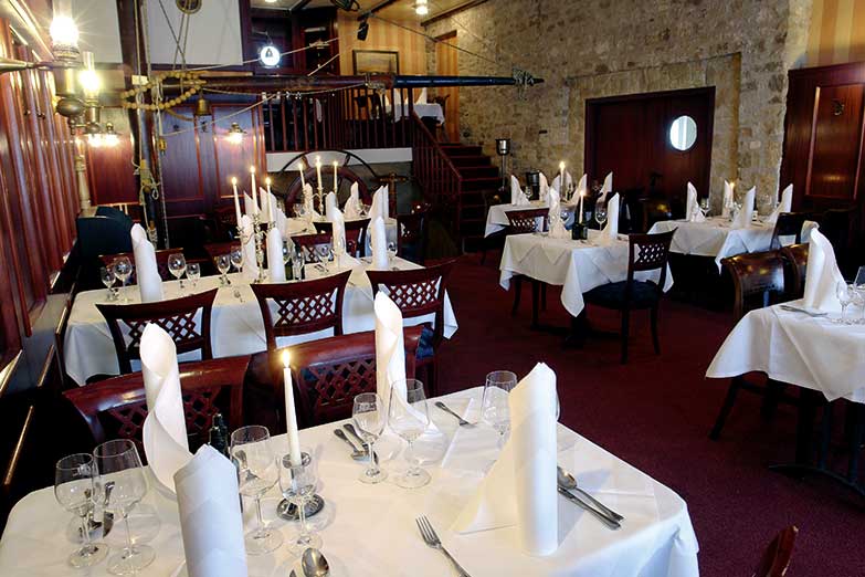 Kapazität: Gewölbekeller bis 70 Personen, Kajüte bis 75 Personen, Salon bis 35 Personen, Terrasse bis 100 Personen