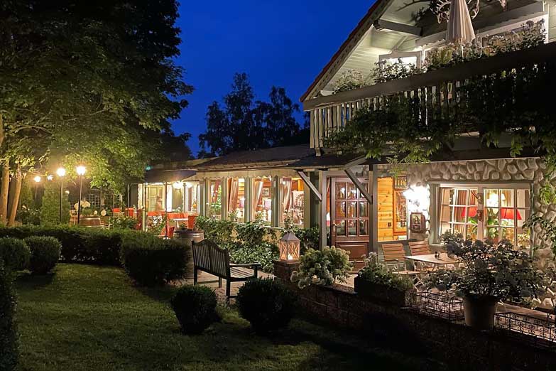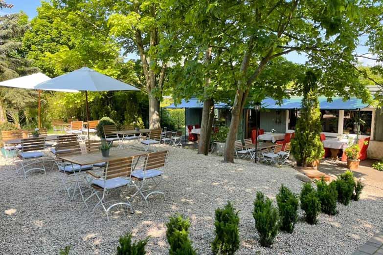 Schön angelegter Außenbereich mit 60 Plätzen und einem idyllischen Blick ins Grüne.