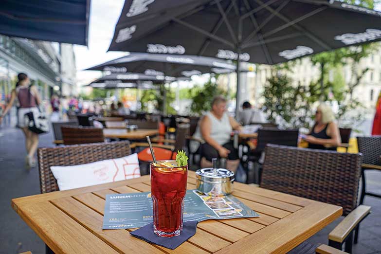 Terrasse mit 100 Plätzen auf dem Bohlweg und schönem Blick auf die Braunschweiger Schloss-Arkaden.