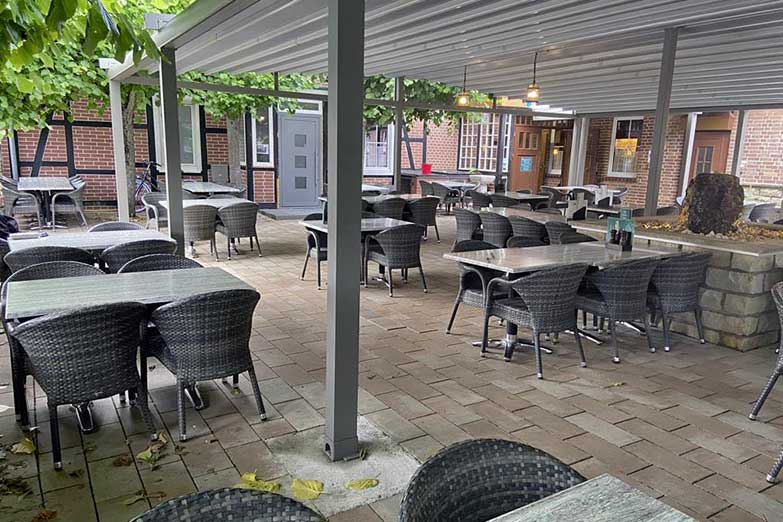 … ist der mit Natursteinen, Lindenbäumen, Springbrunnen und stimmungsvoller Lichttechnik gestaltete Biergarten mit circa 100 Plätzen. Hier kann auch mal ein kleiner Sommerschauer kommen und man kann trotzdem entspannt weiter sein Essen genießen, geschützt durch die neu geschaffene Überdachung des Außenbereichs.