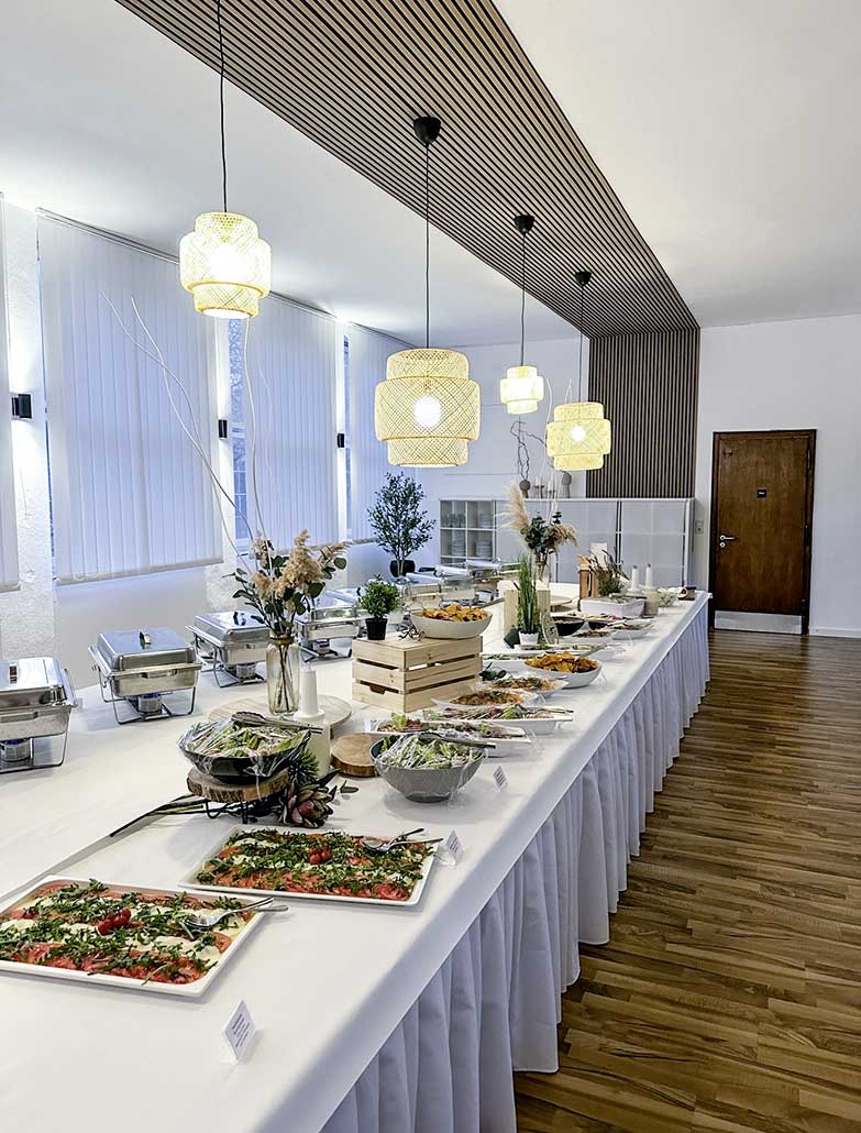 Kulinarisch bietet euch der Hauscaterer eine vielfältige Buffetauswahl - von italienisch, mediterran, regional, fingerfertig bis zu vegetarisch und vegan. Und ihr könnt nach Absprache feiern „bis zum Umfallen” - es gibt keine Sperrstunde.