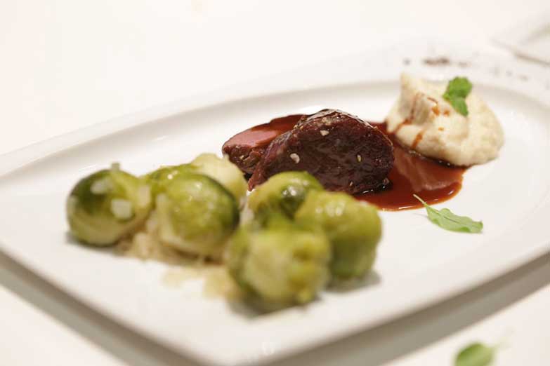 3. Gang: Hirschrücken oder Rinderfilet mit Bordelaiser Sauce, grünen Speckbohnen und Kartoffelgratin