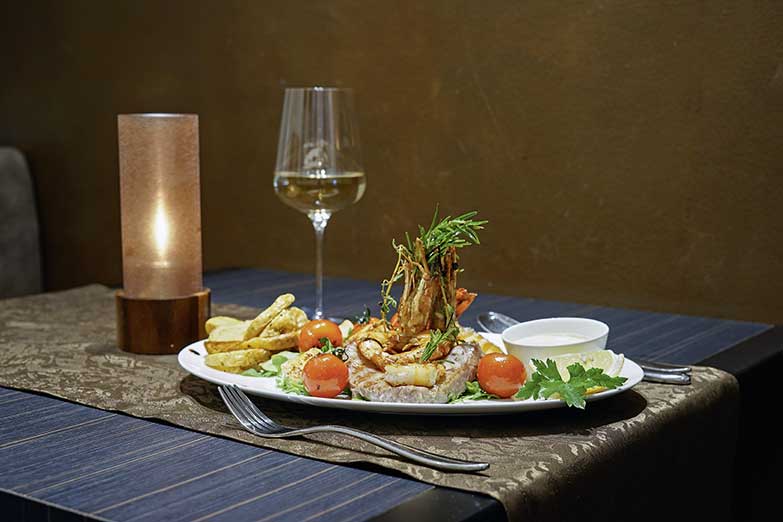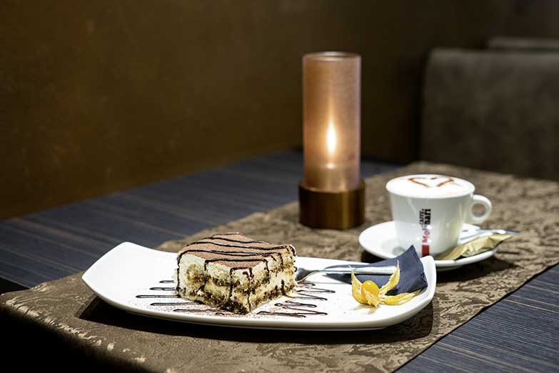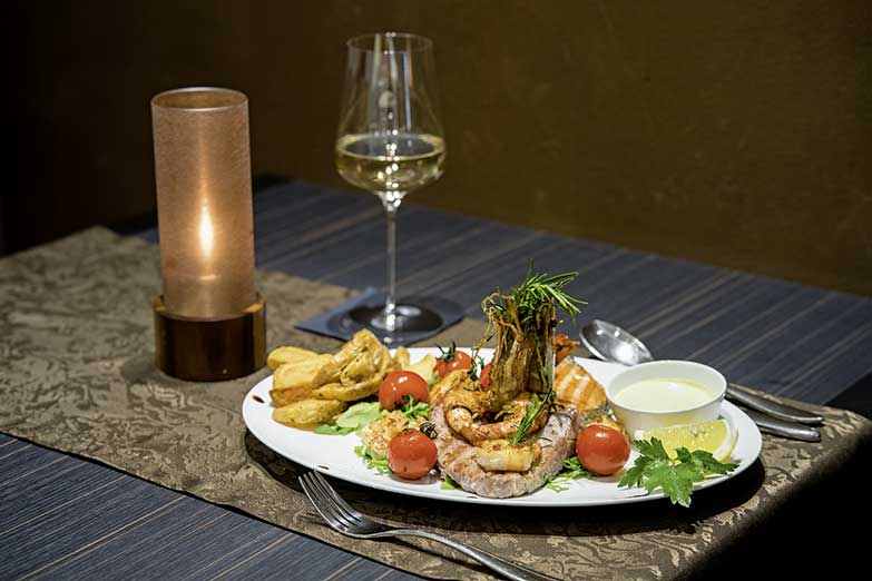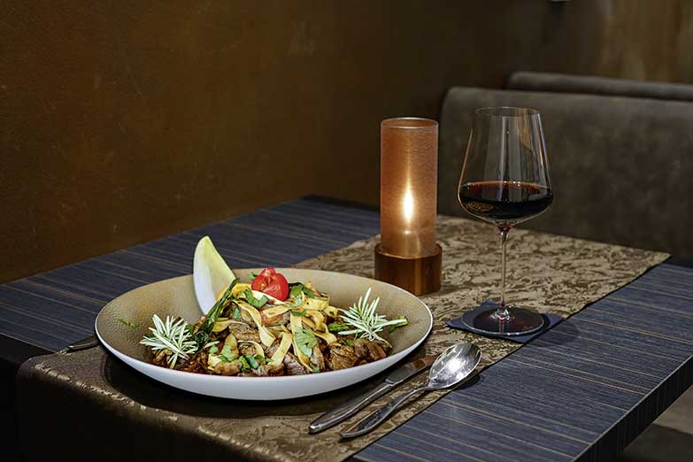 Die Küche bietet das volle italienische Programm: Antipasti, Salate, Pizza, Pasta, Risotto, Fisch- und Fleischvariationen. Als Starter z.B. Carpaccio di Manzo, Vitello Tonnato Classico oder die hausgemachte Edel-Fischsuppe. Danach vielleicht Taglierini mit schwarzen Trüffeln im Pizzateig-Nest, Risotto Milanese mit Garnelen und Safran oder Tagliatelle mit Rinderfiletstreifen und Champignons. Zum genussvollem Hauptgang locken Kalbskotelett mit Salbeibutter und Rosmarin, gegrillte Lammkoteletts, Rinderfilet in Trüffelsauce oder eine Fischvariation mit mediterranen Kräutern. Dazu wird jeweils ein kleiner gemischter Salat, Ofenkartoffeln, Broccoli oder Spinat gereicht.