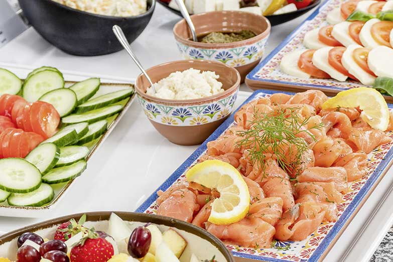 … mit frischem Brot und Brötchen, einer großen Auswahl an Käse, Wurst, Marmeladen, Honig … Außerdem Rührei und Bacon sowie Müsli, verschiedene Joghurtsorten, Obstauswahl, Kaffee, Tee und Orangen- und Multivitaminsaft.