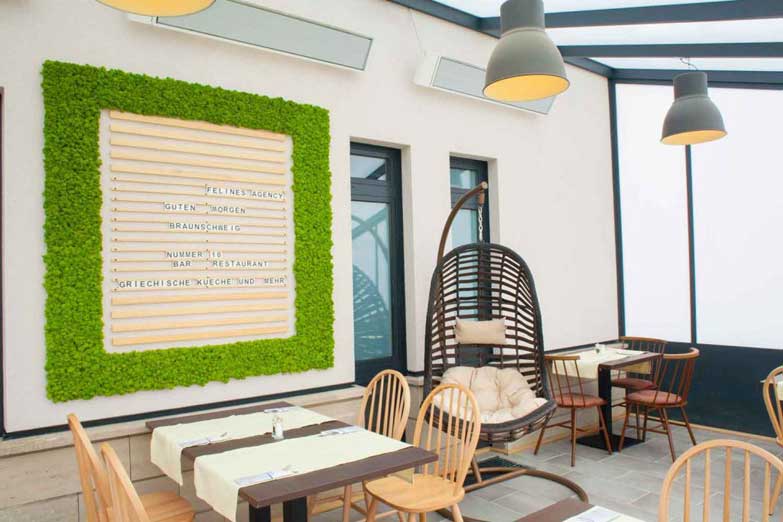 Ruhig gelegener, schön begrünter Biergarten mit 50 Plätzen im Innenhof der Hotelanlage. Ein idyllisches Plätzchen für ein griechisch-mediterranes Dinner oder einen coolen Drink.