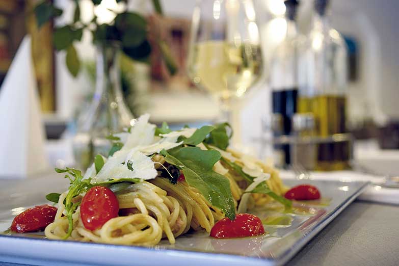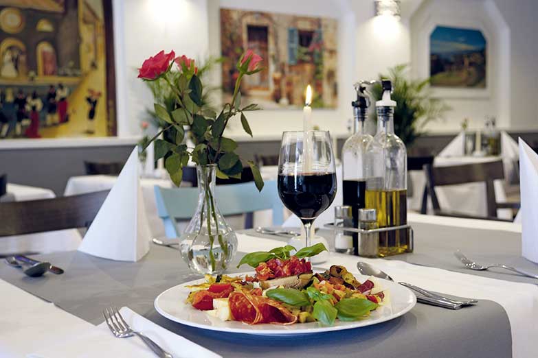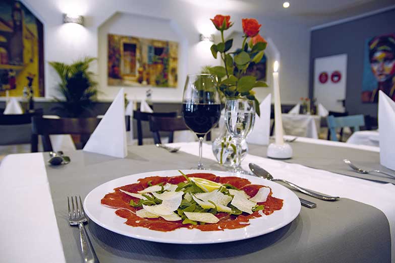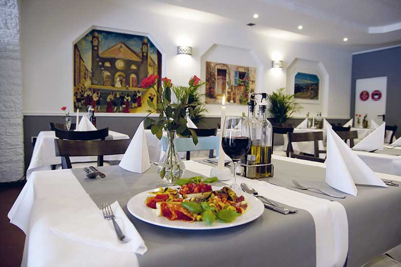 Hier finden bis zu 80 Gäste Platz, um in einem gemütlichen, mediterranen Ambiente authentisch italienisch zu genießen. Es gibt typische Spezialitäten aus der Heimat der Gastgeber: Fischsuppe, Carpaccio, Vitello Tonnato, gemischte vegetarische Antipasti, zahlreiche Pizzen, Pastagerichte, Carne-Variationen z.B. mit Gorgonzola- oder mit grüner Pfeffersahnesauce - dazu je Salat und frittierte Kartoffelscheiben als Beilage, Picatta Milanese, gegrillten Schwertfisch oder die Piatto „Bingo Bingo“ mit Tintenfisch, Scampis, Rindersteak und Lammkoteletts. Je nach Einkauf gibt es weitere Fischvariationen z.B. mit Dorade, Seeteufel, Goldbrasse oder Muscheln. Die monatlich wechselnde Karte, z.B. mit Lammfilet an Salbei-Weißweinsauce bereichert das Angebot.