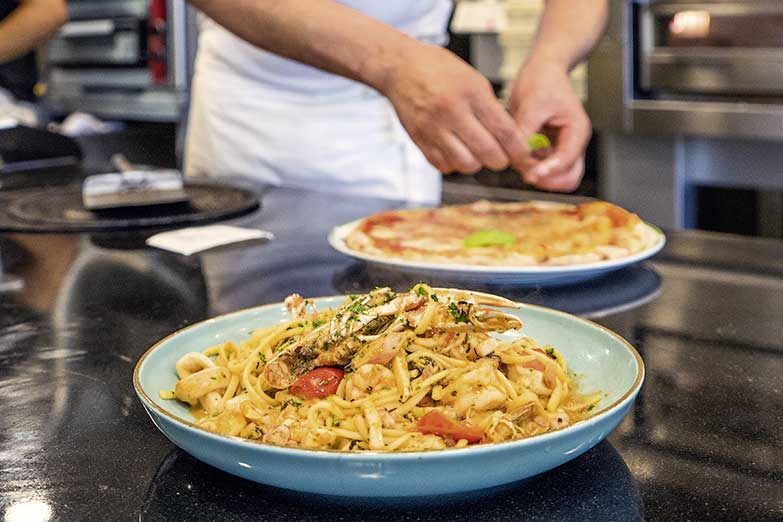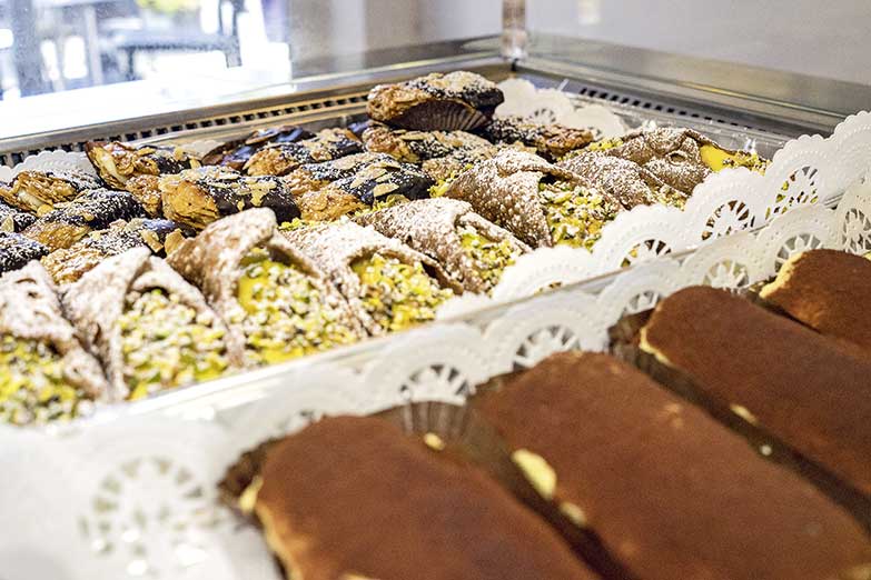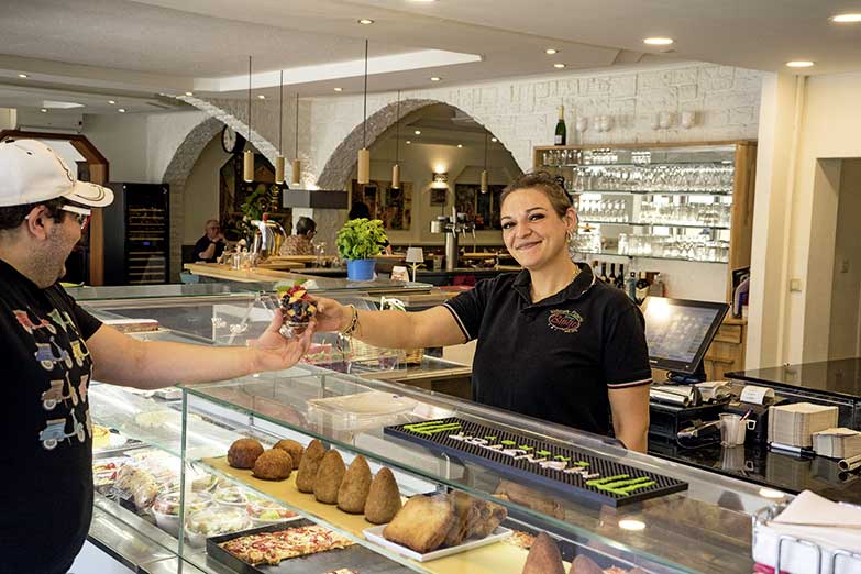 Das Lokal hatte übrigens vor kurzem einen Facelift. So wurde der Bereich für den Außerhausverkauf modernisiert, vergrößert und mit einem appetitanregenden Verkaufstresen inkl. einsehbaren Küchenbereich ausgestattet. Neben den schnellen warmen Gerichten zum Mitnehmen oder der beliebten Pizza auf die Hand, findet man hier nun auch Arrancini, Panini, Sandwiches, Salate, ebenso Patisserie-Leckereien wie Cannoli – frittierte Teigrollen gefüllt mit Pistazien und gesüßtem Ricotta, kleine Vanilletörtchen, Tiramizu, Obst- und Schokokuchen, sowie frisches Obst.