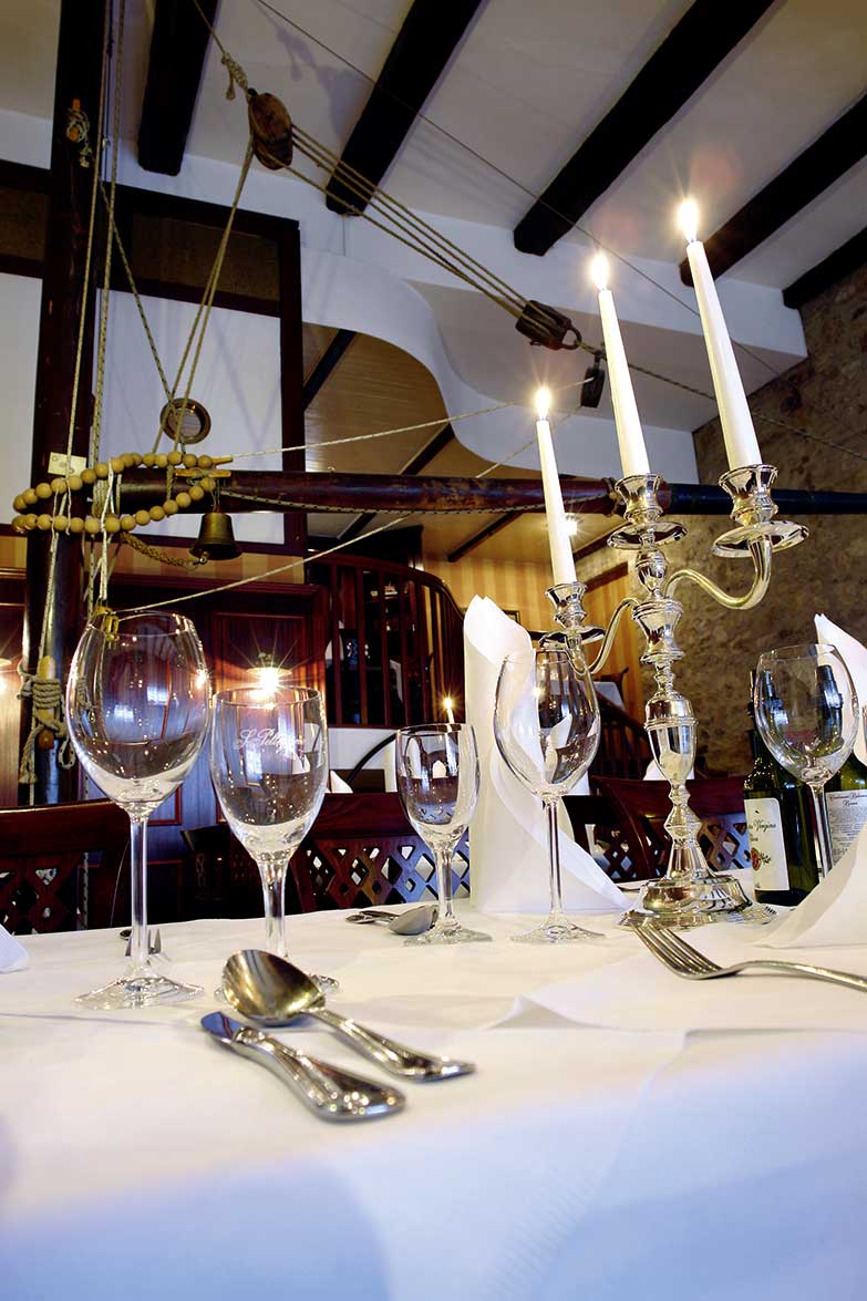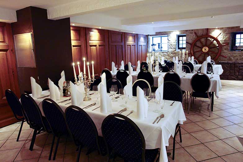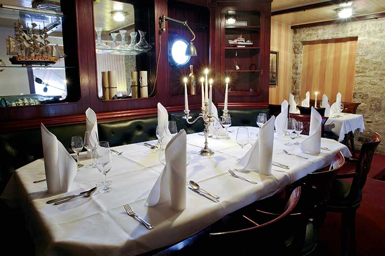 Kapazität: Gewölbekeller bis 70 Personen, Kajüte bis 75 Personen, Salon bis 35 Personen, Terrasse bis 100 Personen
