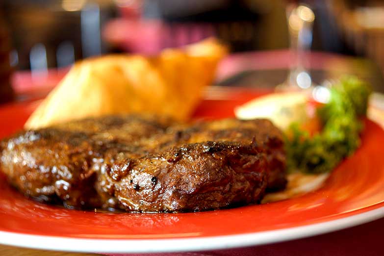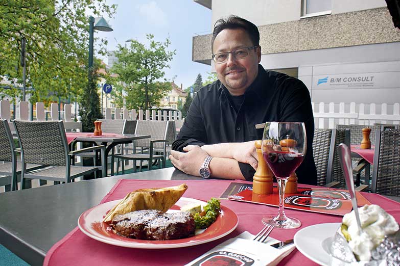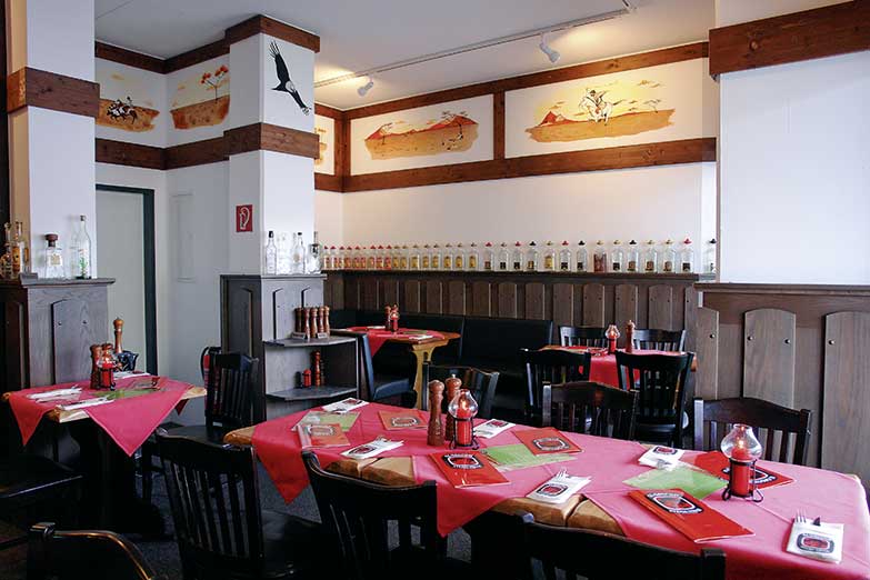 Durch die verglaste Küche kann man den Steakexpertos bei der Arbeit zuschauen und erhält schon mal einen Vorgeschmack auf den baldigen Fleischgenuss. Im El Gaucho werden Qualitätssteaks aus Argentinien klassisch zubereitet … und zwar auf dem Holzkohlegrill, damit der Geschmack des mageren, saftigen Fleisches richtig zur Geltung kommt. Bevor man sich darüber hermacht, bietet sich vielleicht noch ein gegrillter Maiskolben mit zerlassener Butter oder eine hausgemachte Gulaschsuppe an. Die geschmackvoll gewürzten Steaks gibt es vom Rind, Schwein, Geflügel oder Lamm, z.B. zartes Lammfilet (220g) mit Kartoffelscheiben, dazu Special-Creme und Prinzessbohnen oder Mixta Carne „EL Gaucho” (ca. 350g) – ein üppiger Grillteller mit Rind-, Lamm-, Puten- und Schweinefleisch, dazu Speckstreifen und Maiskolben. Ein fleischgewordener Traum: das super saftige Grand Beef „Don Carlos“ – satte 450g feinstes Entrecôte mit typischem Fettauge.