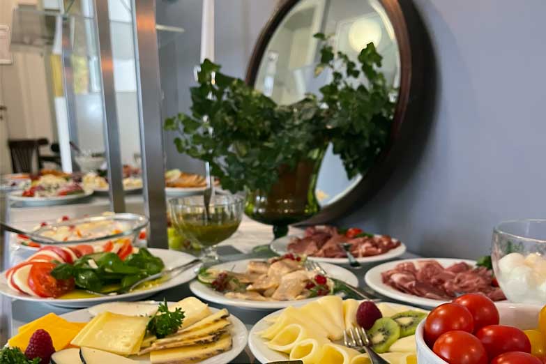 Schönes Frühstücksbuffet … liebevoll präsentiert, reichhaltig und abwechslungsreich: mit sehr hochwertigen Käse-, Fleisch- und Wurstsorten. Auch Brot und Brötchen sind von bester Qualität, handwerklich produziert ohne Zusatzstoffe wie Gärhilfen etc. Zahlreiche Komponenten sind aus eigener Herstellung: z.b. die Quarkspeisen, Antipasti oder das Roastbeef.