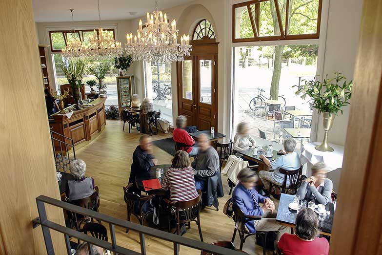 Das elegante Wohlfühl-Ambiente auf 2 Etagen würde sicher auch in der Hauptstadt der Kaffeehäuser, Wien, seine Kunden finden. Helles Parkett, edles Holz, schmiede-eiserne Geländer, prunkvolle Kronleuchter, Stuckornamente, goldgerahmte Spiegel und bezaubernde Blumenbouquets verleihen dem Café einen sehr warmen, nostalgischen Charme.
