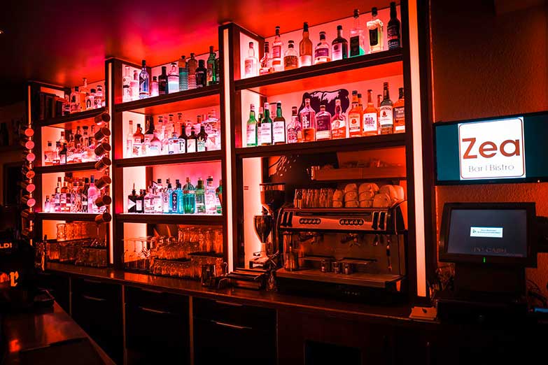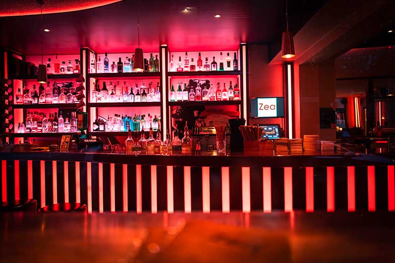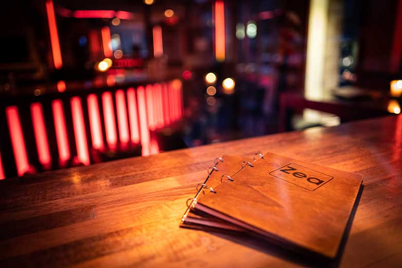 Das separate, stylische Kaminzimmer der Zea-Bar ist ideal für "kleinere" Feiern und lockere Meetings mit bis zu 45 Gästen. Gemütliche Lederbänke, die coole Neonbeleuchtung und der knisternde Kamin sorgen für eine besondere Atmosphäre. Dabei könnt ihr euch mit klasse Cocktails und mediterranen Speisen verwöhnen lassen.