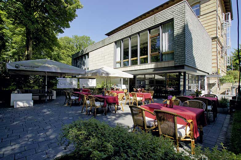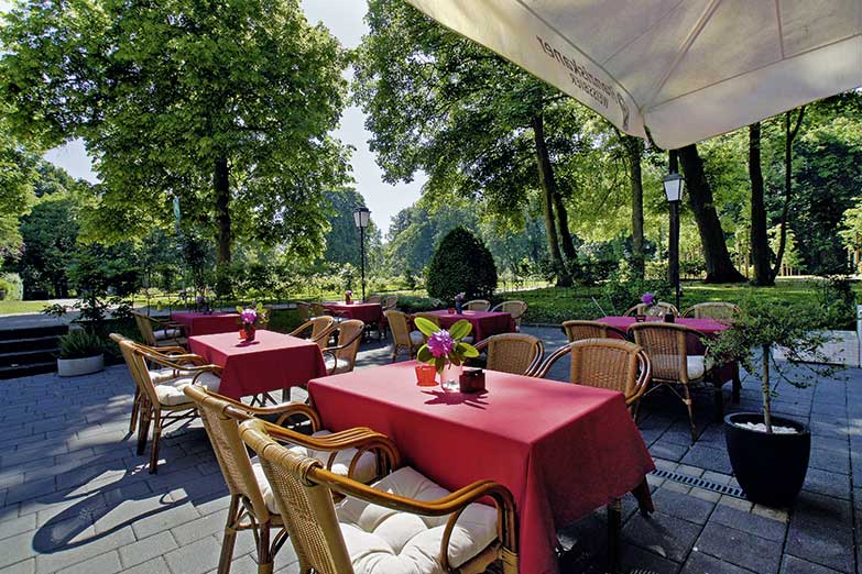 Das Fehthlon hat einen sehr schönen Terrassenbereich, ruhig und idyllisch, mit tollem Blick in den Schlosspark und Platz für bis zu 80 Gäste.