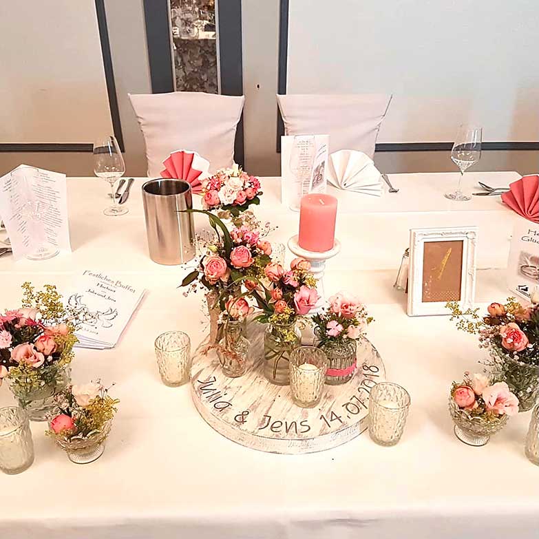 Die Inhaberin Doreen Mildner und ihr Team bietet ein Rundum-sorglos-Hochzeits-Paket an, das auf das Thema der Hochzeit mit dem entsprechenden Farb- und Dekokonzept abgestimmt ist. Dabei werden die Arrangements ganz individuell zusammengestellt: Blumen für den Bräutigam, die Brautjungfern, Trauzeugen, Autoschmuck, Hochzeitsstrauß, Tisch- und Locationdekoration und vieles mehr. Lassen Sie sich gerne frühzeitig beraten, damit dem entspannten "Ja-Wort" nichts mehr im Wege steht.